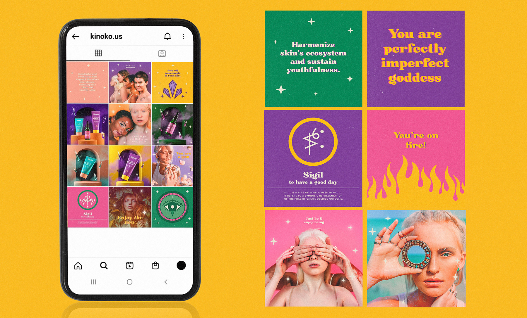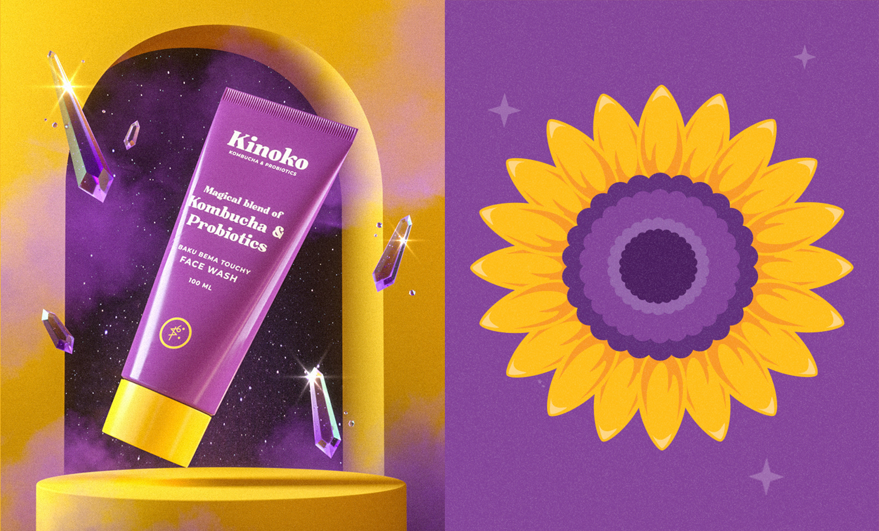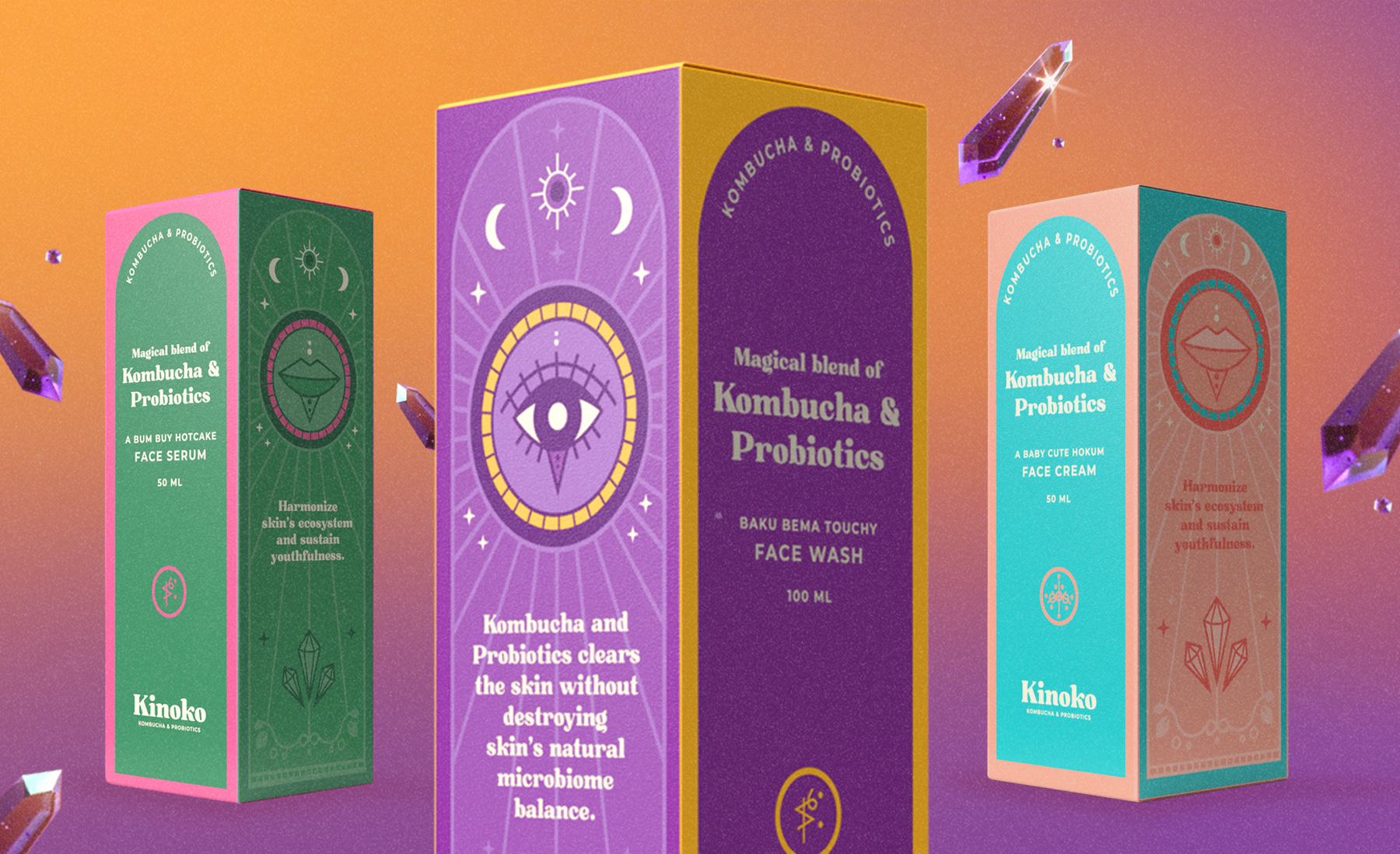 Kinoko ihonhoitosarjan maaginen brändi-ilme kuvituksineen sekä pakkaussuunnittelu